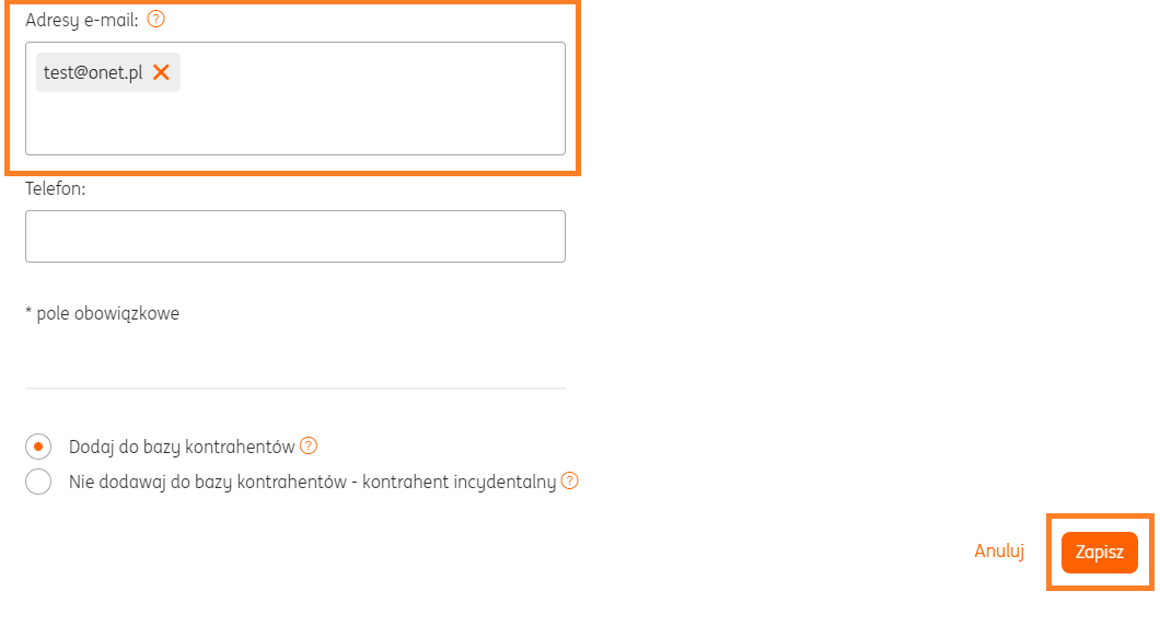 W polu Adres e-mail wprowadź adres kontrahenta. Na koniec kliknij Zapisz.