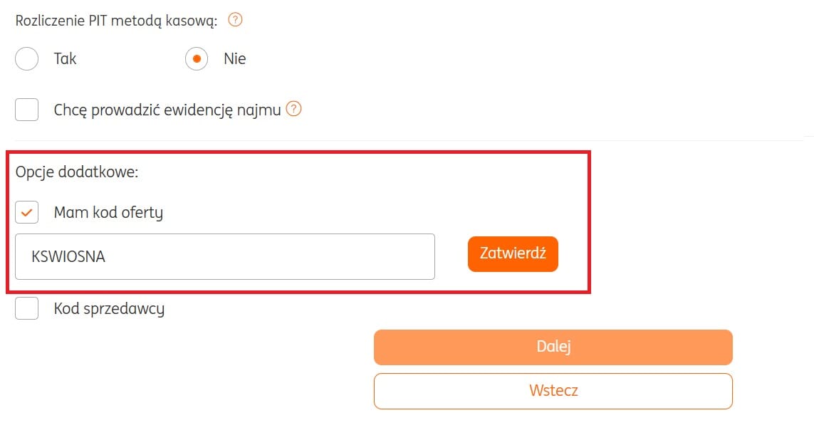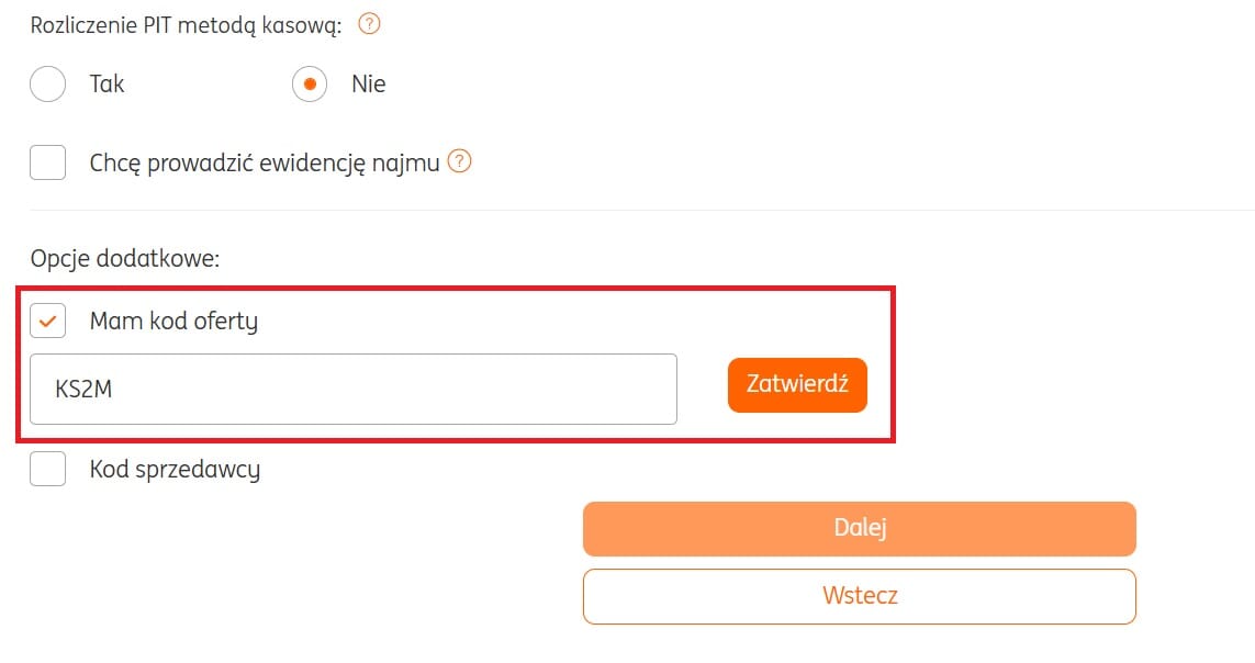 Podczas rejestracji w ING Księgowość podaj kod KS2M w polu Mam kod oferty i kliknij Zatwierdź.